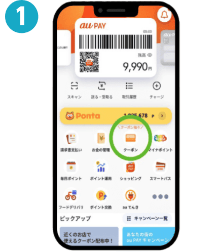 au PAY アプリのホームの下のクーポンから獲得できます。